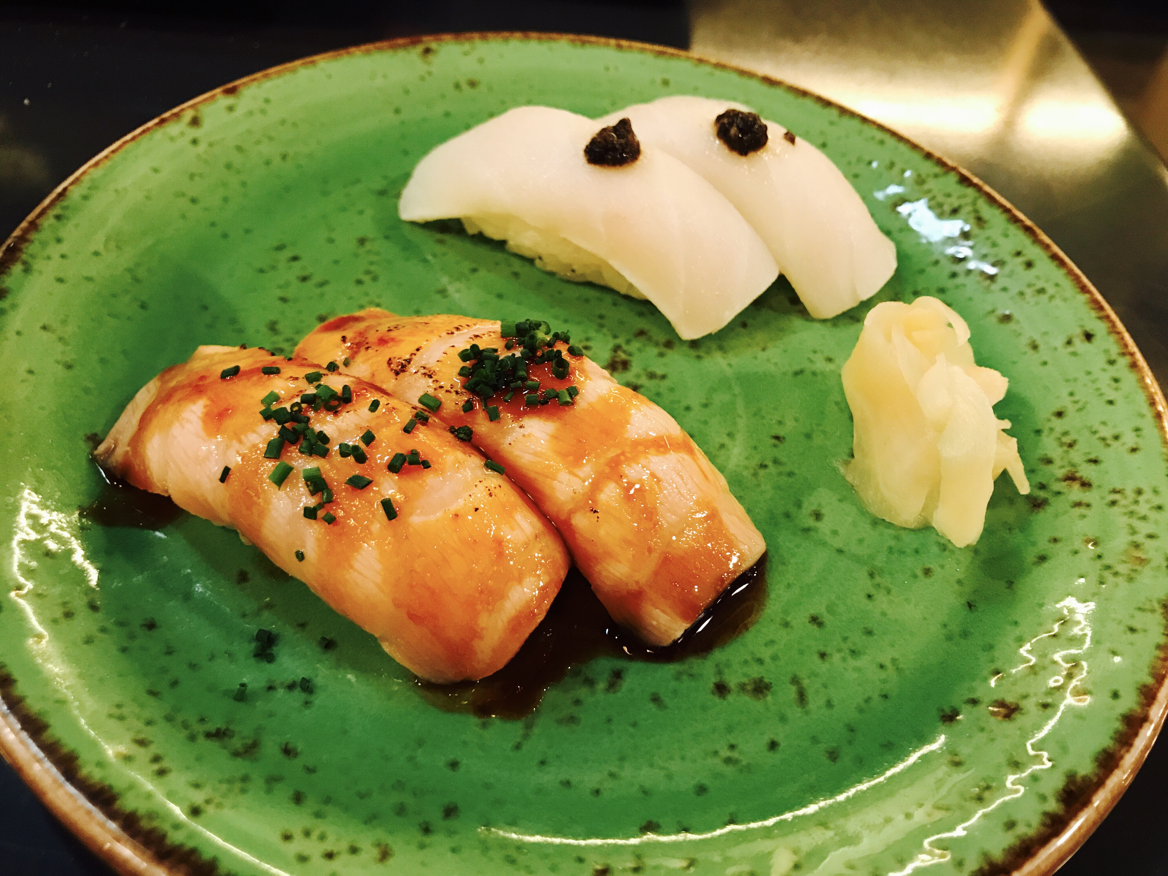 Los niguiris fueron de salmón y pez mantequilla, el que más me gusto fue el de pez mantequilla con un toque de trufa, la combinación del sabor suave del pescado con la trufa queda muy bien.